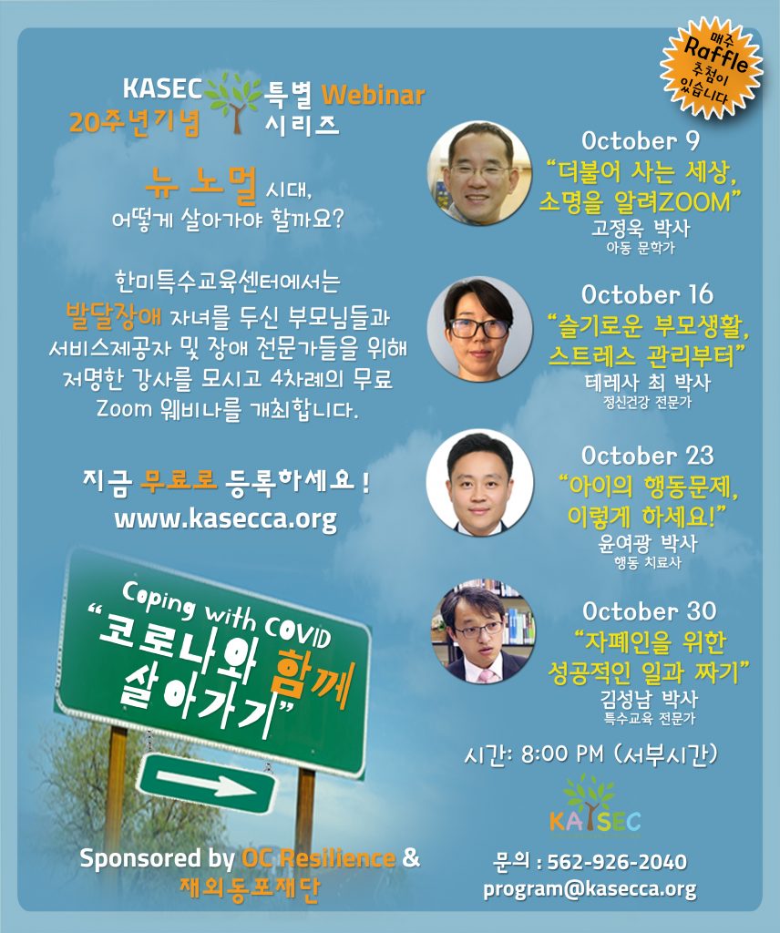 한미특수교육센터에서는 발달장애 자녀를 두신 부모님들과 서비스제공자 및 전문가들을 위해10월 동안 4차례의 무료 웨비나를 개최합니다.