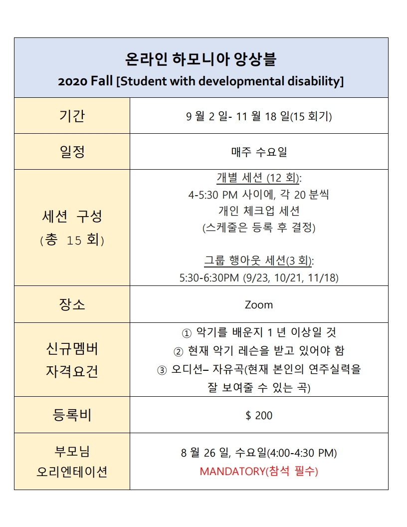 한미특수교육센터의 2020 가을학기 온라인 하모니아 앙상블 이 시작됩니다. 이 프로그램에서는…